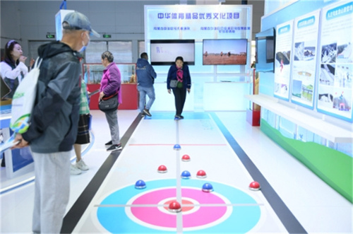 人气最旺的还属冰壶项目体验区,展区设置的两条一大一小冰壶赛道,一条冰蹴球赛道前人流熙熙攘攘,大家都争相体验这项冰雪运动,内蒙古冰雪协会的工作人员对体验的人员进行规则讲解和辅导,通过互动体验,加深大家对即将在内蒙古举办的“十四冬”的了解、对内蒙古体育工作的了解。