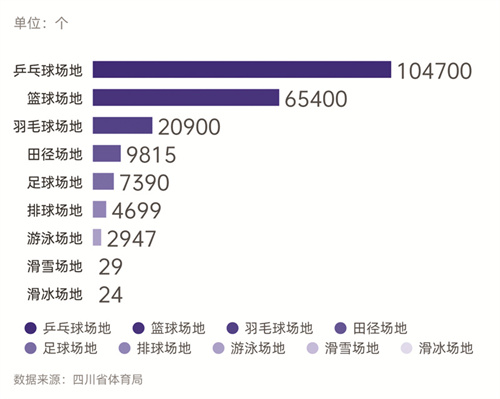 乡村体育设施是主场,各类体育场地便是主角。在四川省体育场地中,共有田径场地9815个、游泳场地2947个、球类运动场地20.85万个、冰雪运动场地53个等基础大项场地,相关乡村运动健身服务体系构建得到大幅提升。