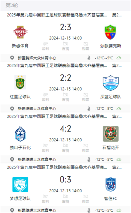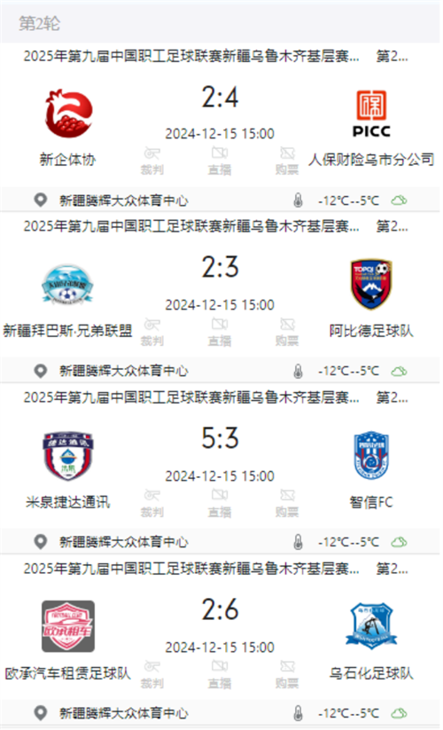 12月21日、22日,2025年“全民健身 健康中国”第九届中国职工足球联赛(新疆乌鲁木齐基层赛)暨新疆职工五人制足球联赛在新疆腾辉大众体育中心,进行了第二轮的较量。