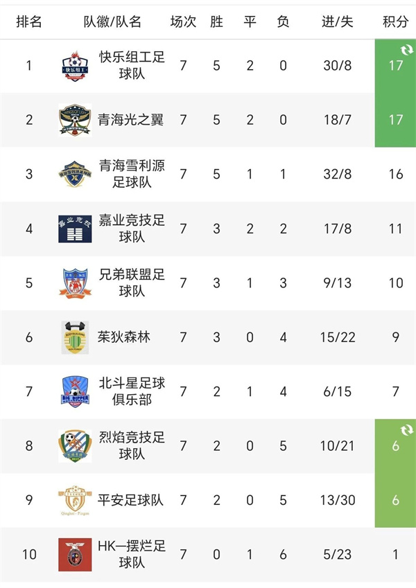 A、B 两组共 16 支球队展开激烈角逐。其中,A组北极星足球俱乐部表现尤为亮眼,以 7 胜 0 平 0 负的傲人战绩领跑 A 组,净胜球高达 + 27;青海睿骏俱乐部则以 5 胜 1 平 1 负的成绩紧随其后。