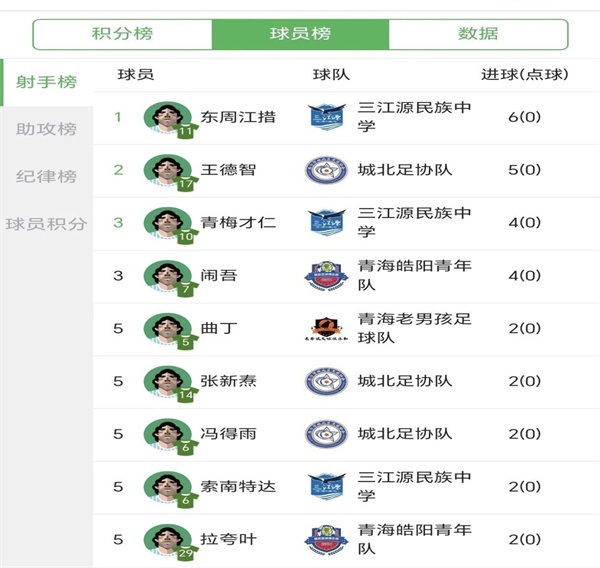 三江源民族中学共有 3 名球员上榜(东周江措、青梅才仁、索南特达),合计贡献 12 球,占球队总进球数(18 球)的 66.7%,进攻端对主力球员依赖明显;城北足协队 3 人上榜(王德智、张新焘、冯得雨),展现出球队在进攻端具备一定实力,但防守方面仍有提升空间。