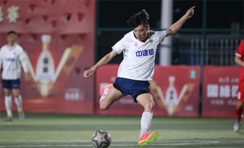 图注:麒凯建筑88号巩金远(红色上衣)大力射门。