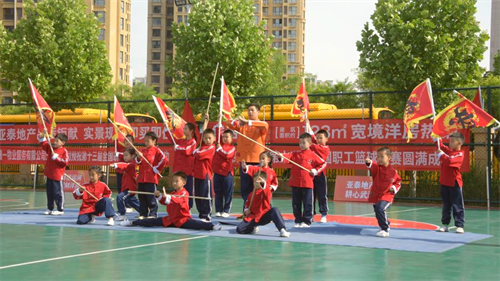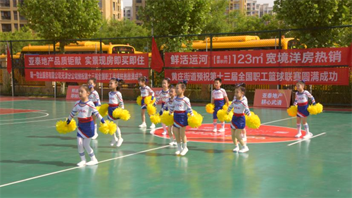 在开幕式环节,为了给参赛球员们加油打气,来自津武门武术会馆的小朋友们带来了一段武术表演,用他们虎虎生风的拳脚诠释运动的激情与力量!紧接着,睿思鸿苑幼儿园的小朋友们也用他们活力四射的啦啦操表演彰显社区居民和社会各界人士对本次赛事的热切期待,更体现了黄庄街道上下和谐融洽的良好氛围。