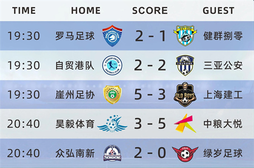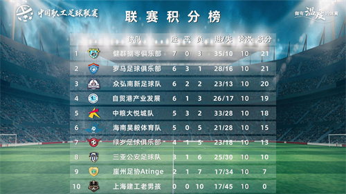 本轮比赛跌宕起伏,精彩纷呈!榜首大战健群捌零憾负罗马但仍凭净胜球守住榜首;自贸港与公安队上演对攻好戏握手言和;崖州足协与老男孩联手奉献8球盛宴;大悦城火力全开收获大胜;众弘体育则依靠蒙平的出色发挥和对手失误带走三分。积分榜争夺日趋白热化,积分形势也依然扑朔迷离!期待下一轮更加精彩的较量!