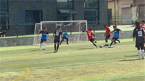 图注:天毅汽车城11号陆少龙(红色上衣)突破起脚射门。