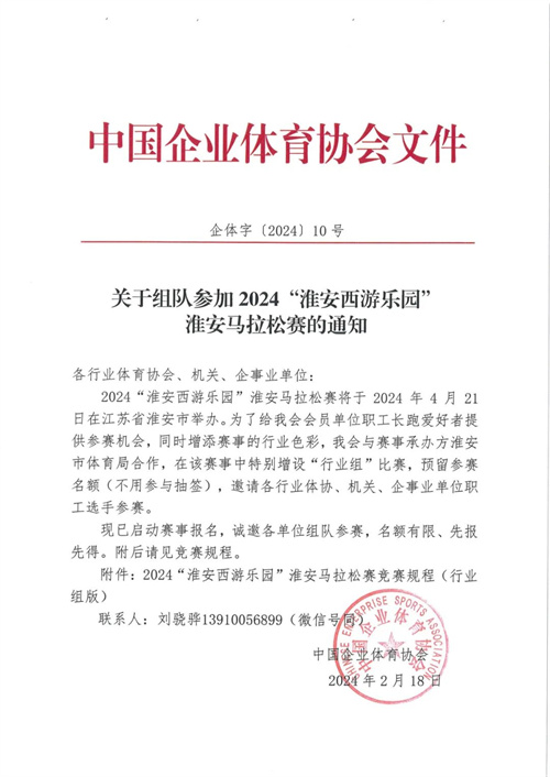 关于组队参加2024“淮安西游乐园”淮安马拉松赛的通知