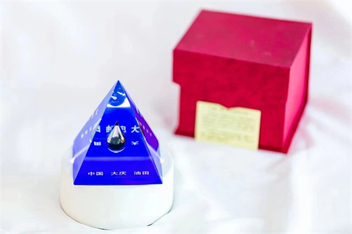 虽然体型不大,但“一滴油”堪称中国石油文化的完美体现。晶莹剔透的外型中,真空密封了大庆油田第一口油井的一滴可流动原油。从不同角度,可以看到不同的折射效果,更是浓缩了中国大庆油田半个多世纪的历史变迁。