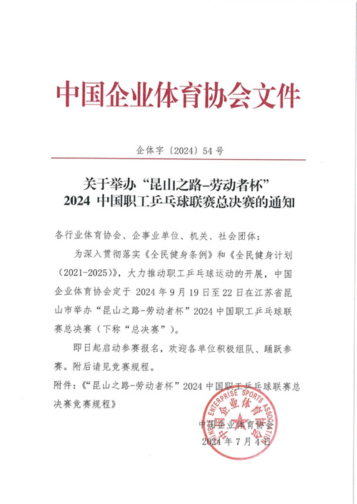 关于举办“昆山之路 - 劳动者杯”2024中国职工乒乓球联赛总决赛的通知
