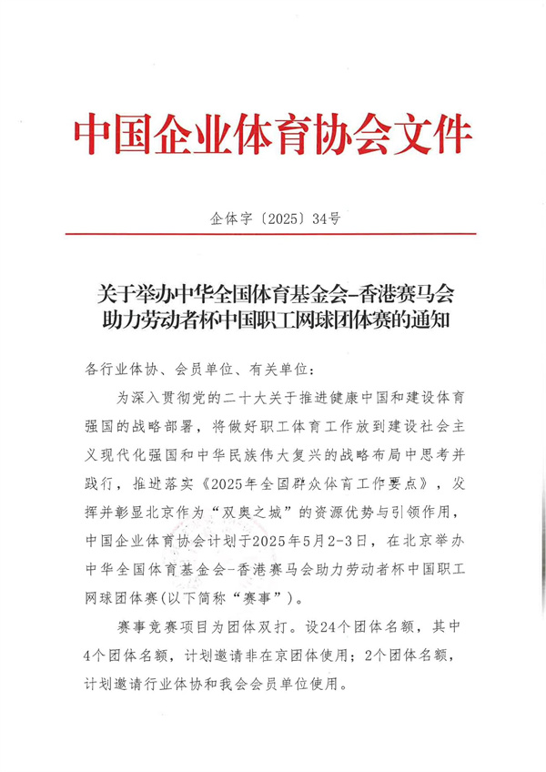 1、关于举办中华全国体育基金会-香港赛马会助力劳动者杯中国职工网球团体赛的通知