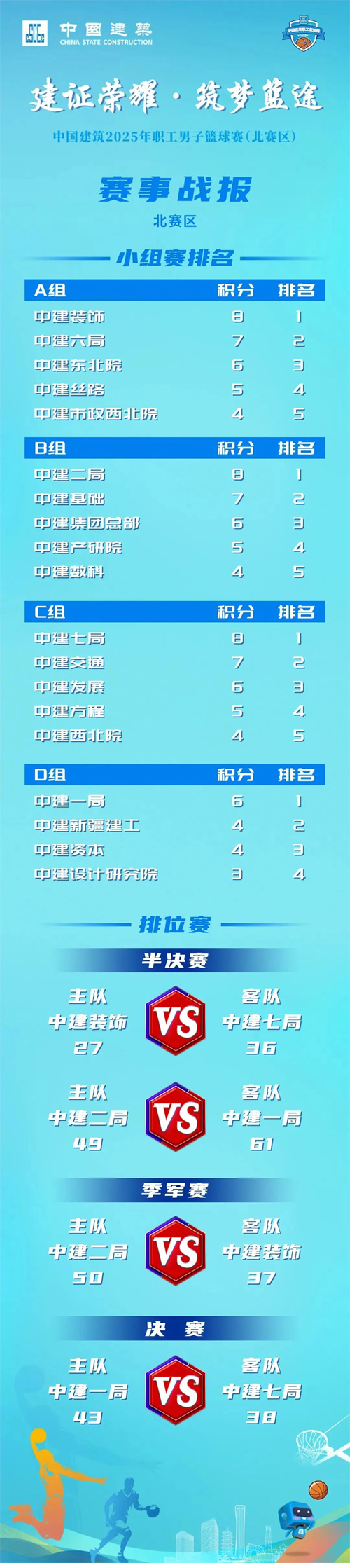 赛场上,全体运动员奋勇拼搏、力争上游,践行“忠诚担当、使命必达”中建精神;裁判团队严格执裁,技术团队精密统计,确保每场比赛有序进行。赛场外,工作团队精益求精、严谨务实,暖心服务、温情守候,赢得参赛各方和观赛职工广泛赞誉;万千中建职工线上线下声浪如潮,共同奏响“筑梦篮途”的奋斗乐章。
