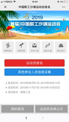 信息系统针对职沙会不同大项、小项,不同参赛单位、运动队,不同性别组、年龄组,以及运动员、教练员、代表团官员、随队人员、裁判员、组委会工作人员、嘉宾、媒体记者等不同身份参与人员提供报名和注册通道。参与人员可通过“中企体育”微信公众号或中企体协官网进行注册报名。