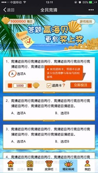 游戏共设置五个赛段,每天解锁一个赛段,每个赛段有三个站点,包含1个宝箱和2个钱袋。参与者通过答题闯关赢得积分(“海贝”)、兑换奖品。