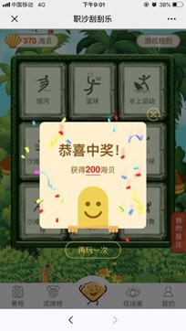 参与者任选一款主题票进行刮奖,刮开即显示中奖的海贝数量。