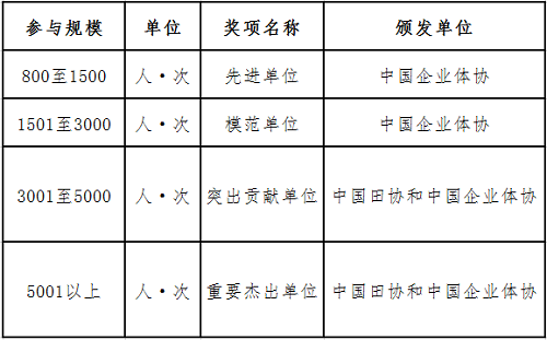 1.根据各单位赛区赛的参与规模,中国企业体协与中国田协为各单位颁发对应的纪念牌匾。标准如下:
