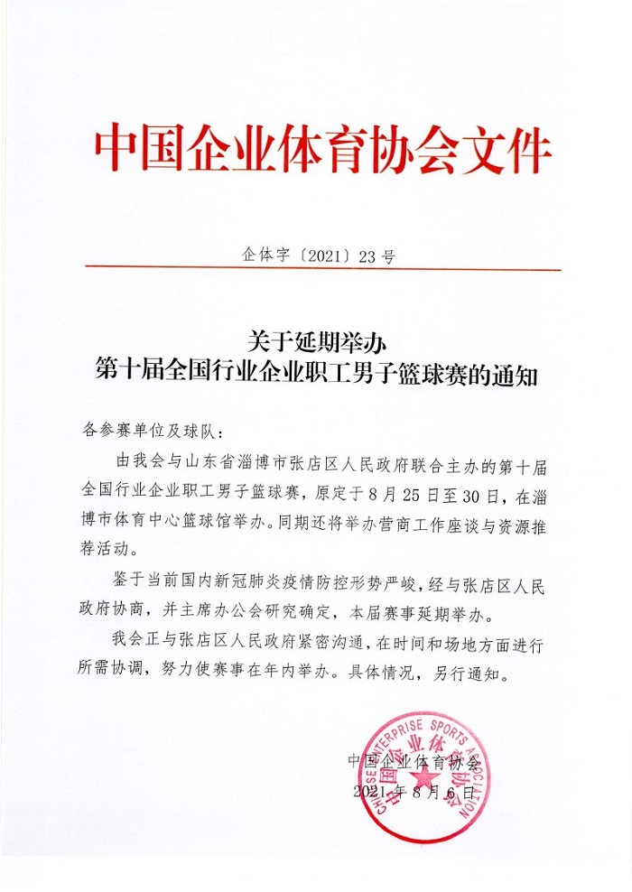 关于延期举办第十届全国行业企业职工男子篮球赛的通知