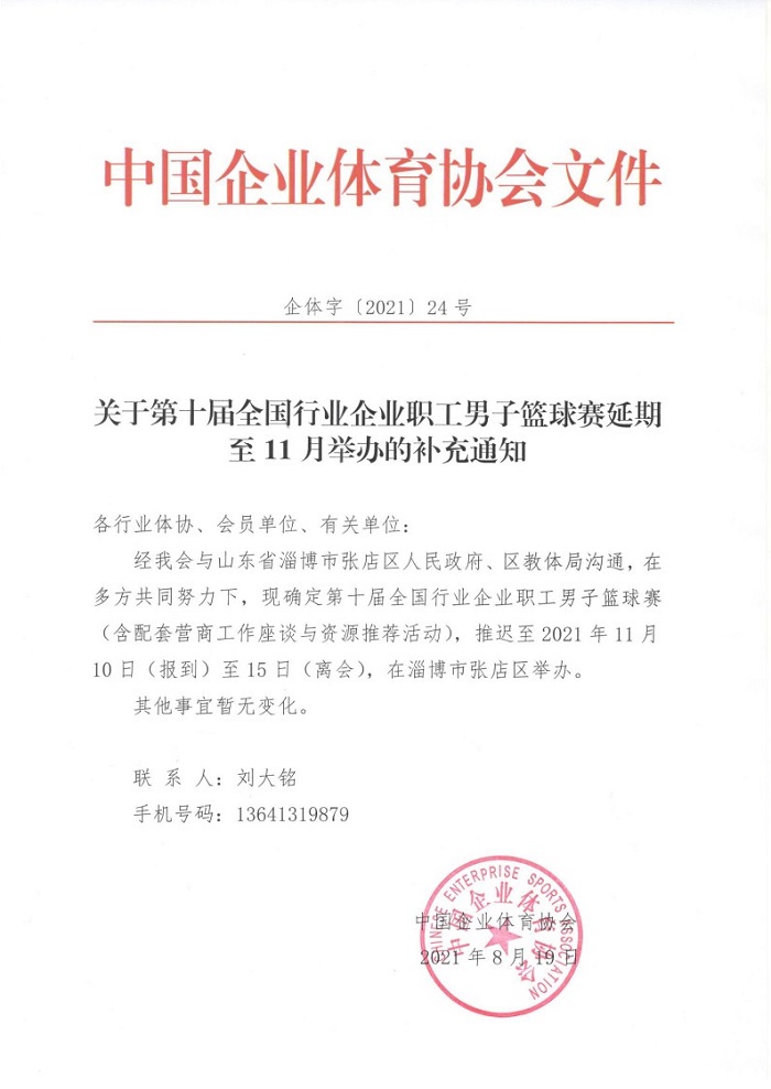 关于第十届全国行业企业职工男子篮球赛延期至11月举办的补充通知