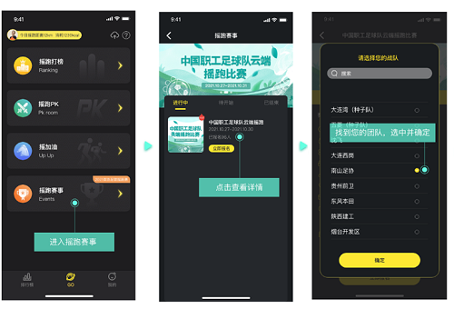 (3)在“GO”入口,点击“摇跑赛事”,找到“中国职工足球队云端摇跑比赛”,点击立即报名,选择您的团队(必填),进入比赛。