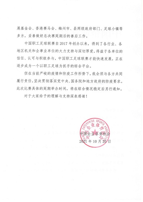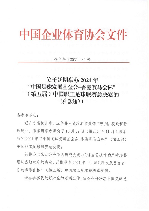 关于延期举办2021年“中国足球发展基金会-香港赛马会杯”(第五届)中国职工足球联赛总决赛的紧急通知