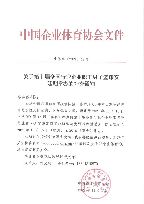 关于第十届全国行业企业职工男子篮球赛延期举办的补充通知