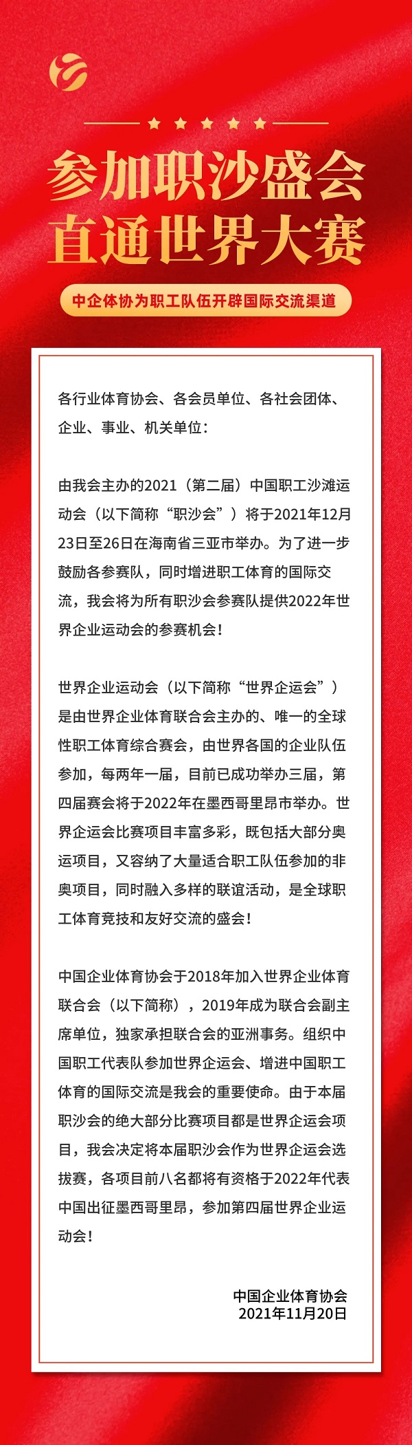 重磅|参加职沙盛会,直通世界大赛,中企体协为职工队伍开辟国际交流渠道