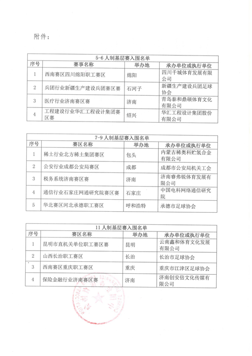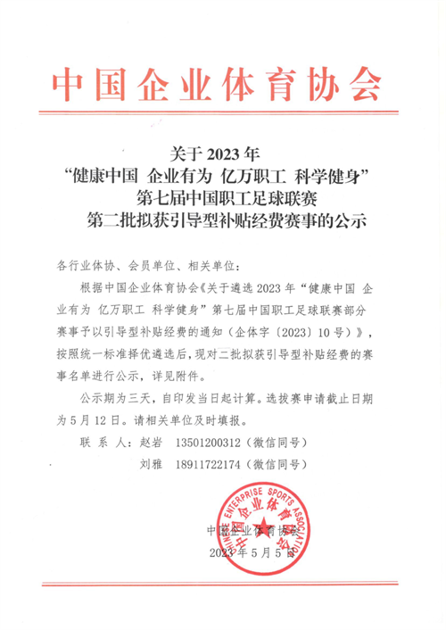 关于2023年第七届中国职工足球联赛第二批拟获引导型补贴经费赛事的公示