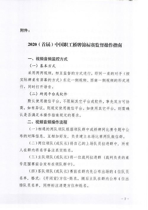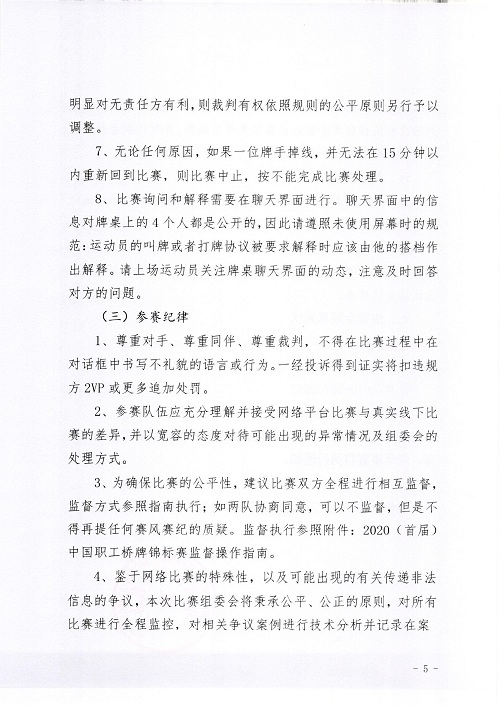 3、为确保比赛的公平性,建议比赛双方全程进行相互监督,监督方式参照指南执行;如两队协商同意,可以不监督,但是不得再提任何赛风赛纪的质疑。监督执行参照附件:全国职工健康促进工程•健康运动2020(首届)中国职工桥牌锦标赛监督操作指南。