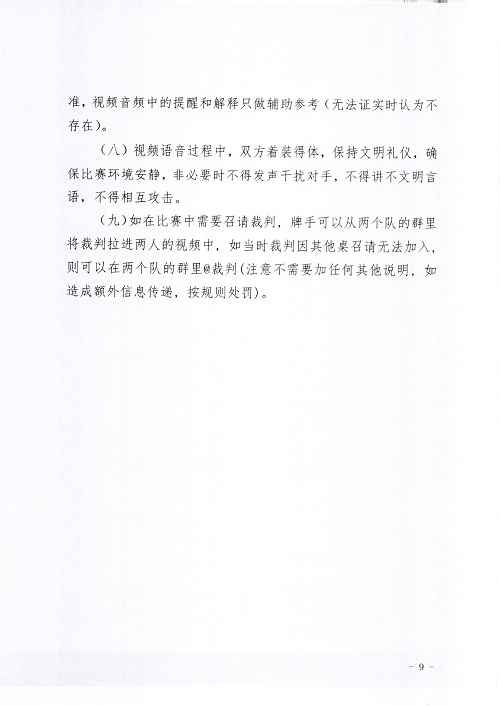 4、如有叫牌和打牌方面的争议,请及时召请裁判。如裁判不能及时到场,请场上队员及时通过截图或录像方式将叫牌和打牌过程以及相关文字证据保留。
