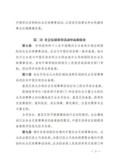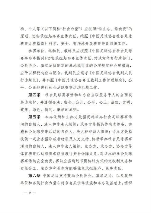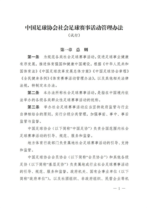 为规范全国社会足球赛事活动,促进足球事业长期健康发展,推动扩大足球人口和规模,根据《中华人民共和国体育法》《中国足球改革发展总体方案》《中国足球协会章程》《全民健身条例》,以及自2023年1月起实施的《体育赛事活动管理办法》和其他相关法律法规,结合社会足球赛事活动特点, 中国足球协会编制形成了《中国足球协会社会足球赛事活动管理办法(试行)》。现予转发,请承办、协办中国职工足球联赛及相关足球赛事活动的各行业协会、会员单位、相关单位遵照实施。