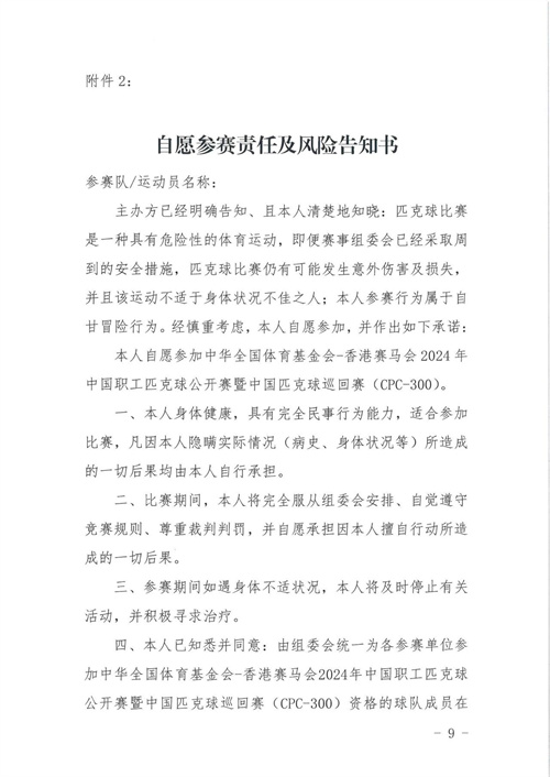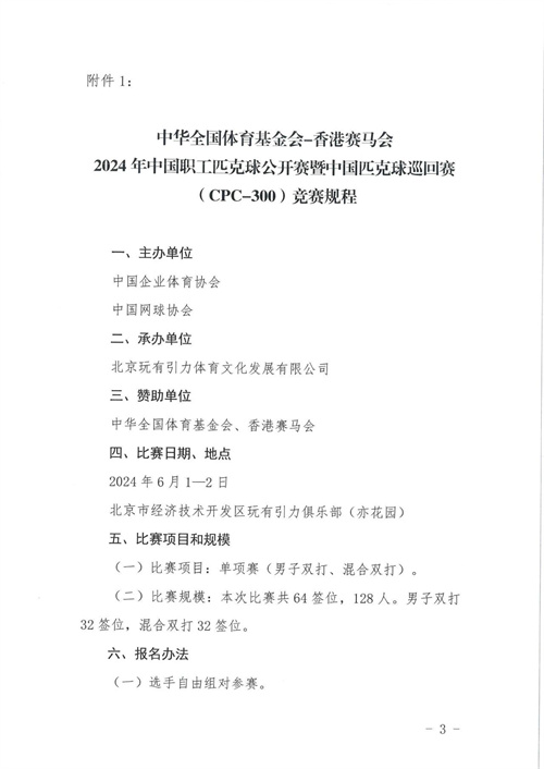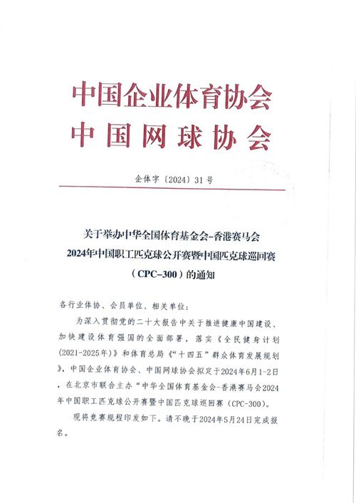 关于举办中华全国体育基金会-香港赛马会2024年职工匹克球公开赛暨中国匹克球巡回赛(CPC-300)的通知