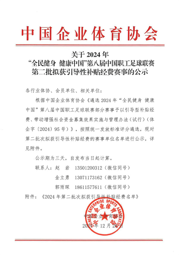 关于2024年“全民健身 健康中国”第八届中国职工足球联赛第二批拟获引导性补贴经费赛事的公示