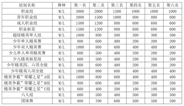 ①“冠军之路•冠军少年“全国体育舞蹈城市联赛奖金组别为:职业组、青年职业组、成人职业组、超级精英单人组、职业新星、少儿单人精英赛、少儿双人精英赛、少儿单人单项精英赛、单人精英新星组,荣耀之星争霸赛组,各奖金组均取各组别前6名颁发奖金、奖杯及证书,报名奖金组别双人不足6对、单人组别不足12人奖金减半。双人组别不足3对的、单人组别不足6人的组别取消颁发奖金,7-12名颁发证书。