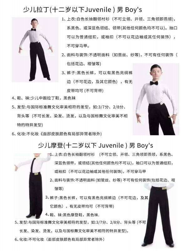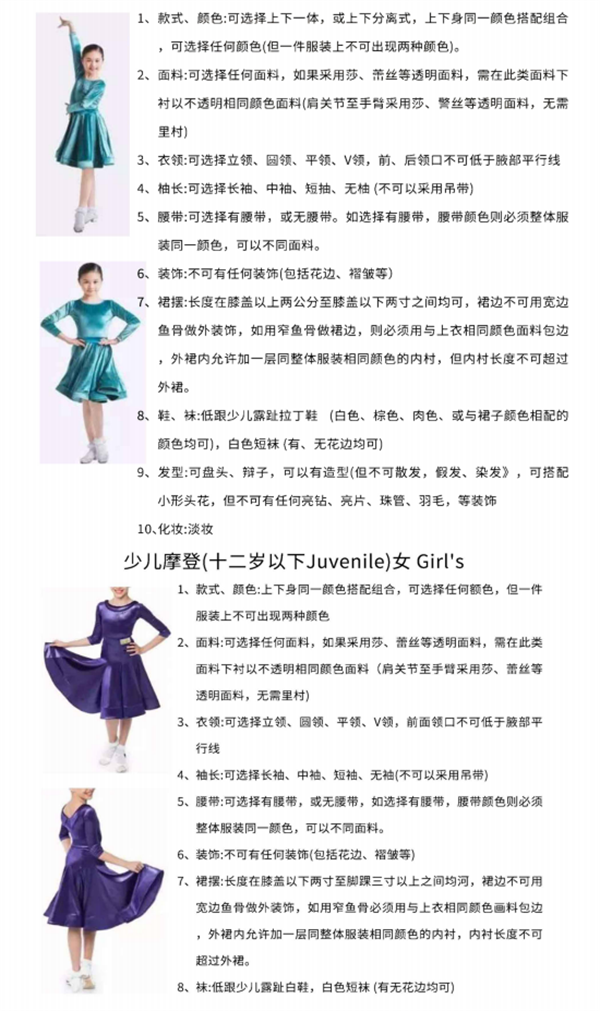 6、服装及动作规定:12岁以下各组别按照体育舞蹈服装和比赛动作规定执行。服装不符合规定者将不允许参加比赛、动作不符合规定者将影响比赛成绩!(业余12岁以下组别动作不得超出体育舞蹈金牌规定动作范畴。业余十二岁精英组别服装按照体育舞蹈有关规定执行,比赛动作不限定)。