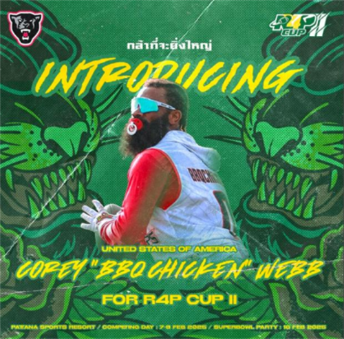 Corey Webb (BBQChicken):美国国家队成员,世界冠军头衔得主,以出色的场上阅读能力和精准的传球闻名,是美国腰旗橄榄球历史上的传奇人物。