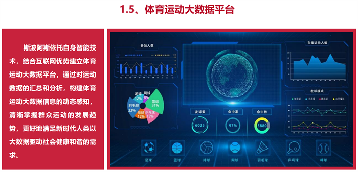 通过物联网、大数据、5G、人工智能等前沿科技,将足球、篮球、排球、网球、羽毛球、乒乓球、冰球、壁球等球类运动打造成为帮助人类运动健身、休闲娱乐、以及球类学习训练、教学培训、技能提升的高科技、数字化、智能化体育运动项目。应用到学校、家庭等全人群。