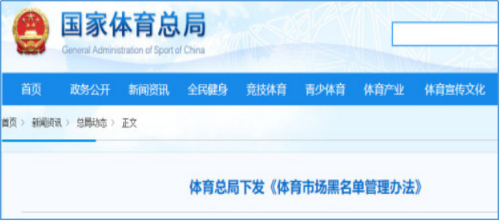 2018年8月9日体育总局下发《体育市场黑名单管理办法》,将严重违反法律、法规、规章的体育经营主体和体育从业人员列入体育市场黑名单,在一定期限内向社会公布,实施信用约束、联合惩戒等措施。并要求省级人民政府体育主管部门应当将具有下列情形之一的经营主体或从业人员列入体育市场黑名单: