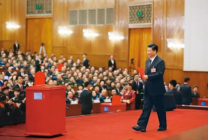 2018年3月17日,十三届全国人大一次会议在北京人民大会堂举行第五次全体会议。习近平当选中华人民共和国主席、中华人民共和国中央军事委员会主席。这是习近平准备投票。 新华社记者 兰红光/摄