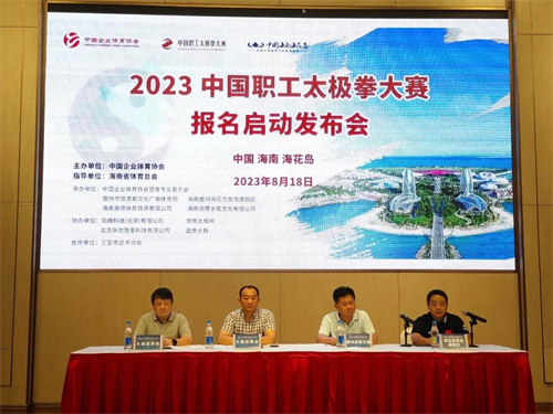 8月18日,在海南儋州市海花岛旅游度假区举办了“2023中国职工太极拳大赛”报名启动发布会,本次大赛由优米下载app主办,海南省体育总会指导;由优米下载app健身专业委员会、儋州市旅游和文化广电体育局、海南儋州海花岛旅游度假区、海南高德体育旅游有限公司、海南德厚太极文化有限公司联合承办;动魄科技(北京)有限公司、北京乐世胜豪科技有限公司、世界太极网、盛世太极作为协办单位。