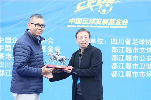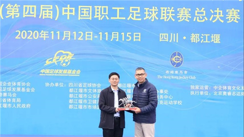 闭幕式上,香港赛马会特别安排了赠送纪念品环节,为了感谢中国足球发展基金会能给予平台支持,让香港赛马会可以贡献出自己的一份力量。由北京香港马会技术开发有限公司总经理黄永志为中国足球发展基金会副理事长兼秘书长马拴友赠送纪念品。