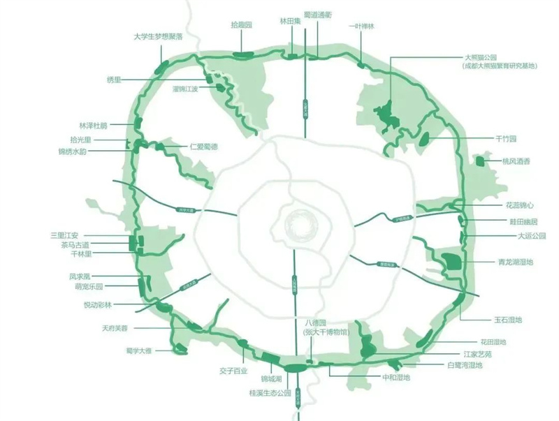 《成都建设践行新发展理念的公园城市示范区行动计划(2021-2025年)》已经提出,为进一步塑造公园城市优美形态,成都兴城集团破解了过去“山水林田湖草”点状化、碎片化问题,成都兴城集团通过连通“河湖网”,串联“公园链”,系统打造城市“生态绿环”。被道路分割的河流、湖泊、森林、田野等生态区域由绿道连线成片、串珠成链。兴城集团还将持续践行“五绿润城”行动,建设大熊猫国家公园“生态绿肺”、建设龙泉山城市森林公园“城市绿心”、建设天府绿道“活力绿脉”、建设环城生态公园“超级绿环”、建设锦江公园“精品绿轴”,构建起蓝绿交织的公园体系。